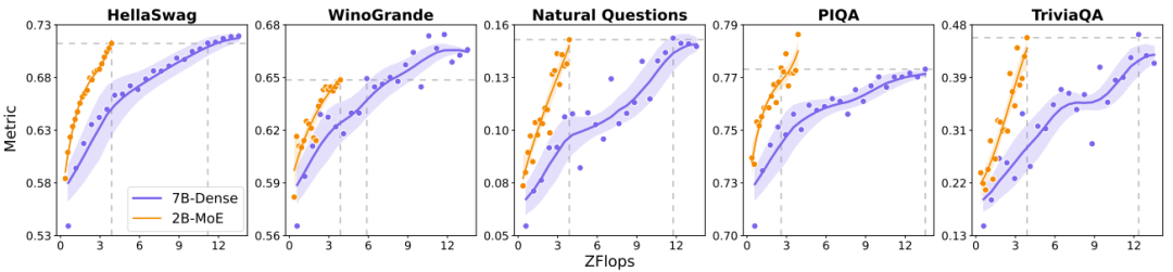 可以看到,在多种基准上,当计算负载一样时,MoE 模型的表现要大幅优于密集模型。