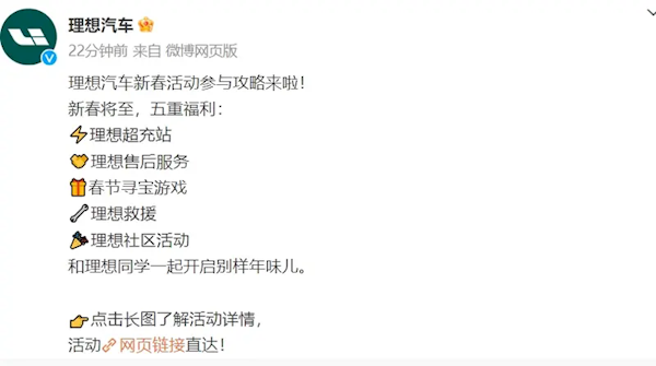 春节寻宝游戏将在理想L系列车型和理想MEGA上线,完成寻宝任务可抽取惊喜盲盒和限量微信红包封面。