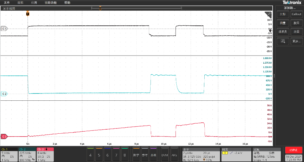 动态特性测试更是亮点纷呈。由于泰克科技目前的GaN测试电路最大测试电压为1000V,为确保测试安全,双方在900V电压条件下对该器件进行了双脉冲测试。测试条件为:Vds = 900V,Rgon = Rgoff = 2Ω,Vgson = 3V, Vgsoff = -8V, Id = 20A,负载电感L = 200uH。