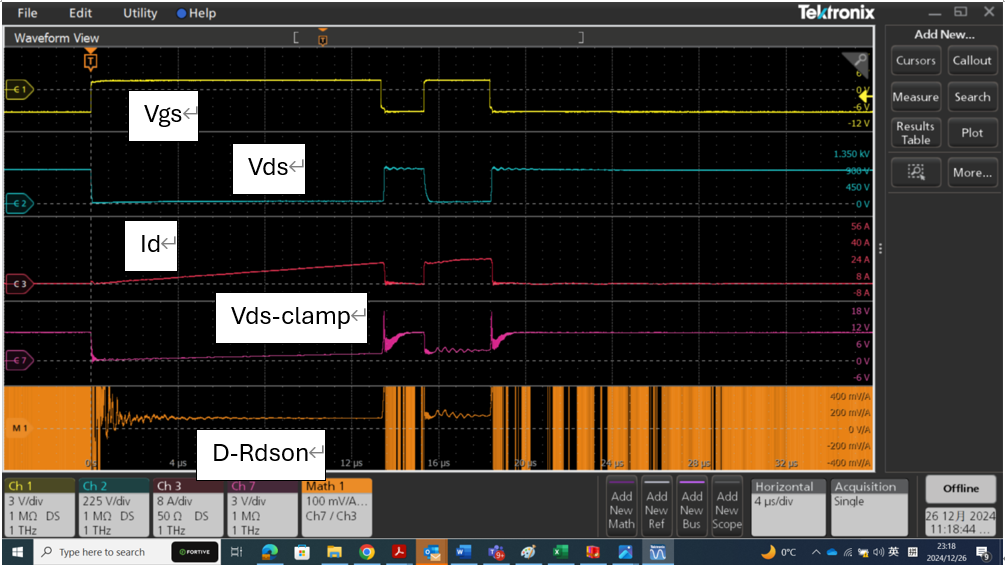 为进一步精准测量功率器件在开关过程中的动态导通电阻值,泰克科技运用钳位探头对器件进行深入测量。钳位探头可有效过滤信号高压部分,以较小量程精准测量低压部分,尤其适用于快速开关条件下,准确测量导通条件下的器件两端电压降。通过电压钳位探头测量得到的钳位电压Vds-clamp,结合导通电流Id,依据欧姆定律计算得出动态导通电阻D-Rdson。