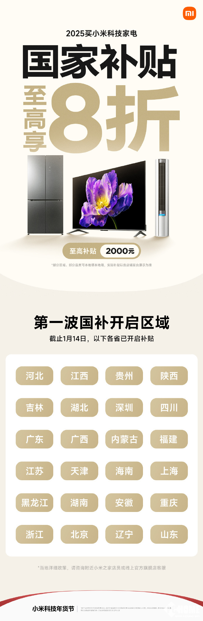 1月15号消息,小米商城公布了小米科技家电开启国补,至高享8折优惠,至高可获得2000元补贴。