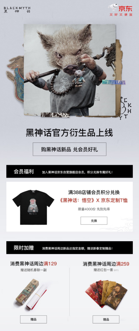 国产3A游戏《黑神话:悟空》自上线以来热度不断,游戏相关衍生品也受到不少消费者关注。为了让消费者能更快入手自己心仪的产品,近日京东上线了诸多黑神话官方衍生品,在京东下单并加入黑神话京东自营旗舰店会员的消费者,不仅能享受到满388店铺会员积分兑换《黑神话:悟空》×京东定制T恤的福利,还有消费黑神话周边新品满129元赠送随机春联一副、消费黑神话周边新品满259元赠送红包一套的实在权益,感兴趣的消费者现在就来看看都有哪些新品值得入手吧。