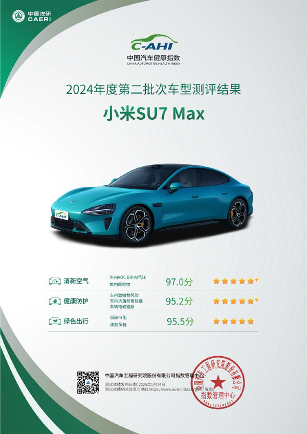 同时,在C-AHI健康指数的测评中,小米SU7 Max在清新空气、健康防护和绿色出行三大项测评中均得分95+,充分展示了其在健康出行方面的卓越表现。