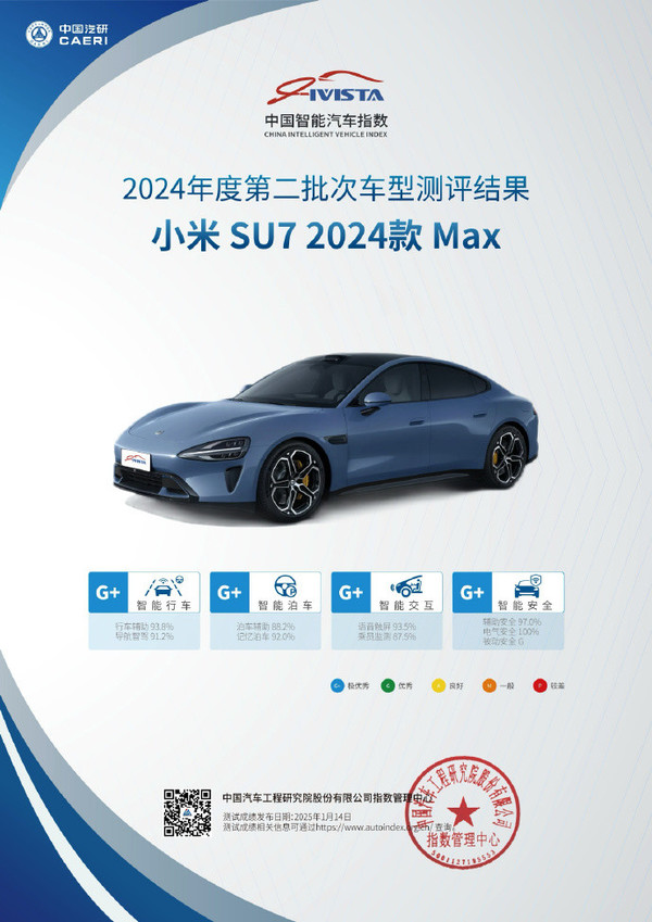小米SU7获中国智能汽车指数4G+佳绩 健康指数也获高分