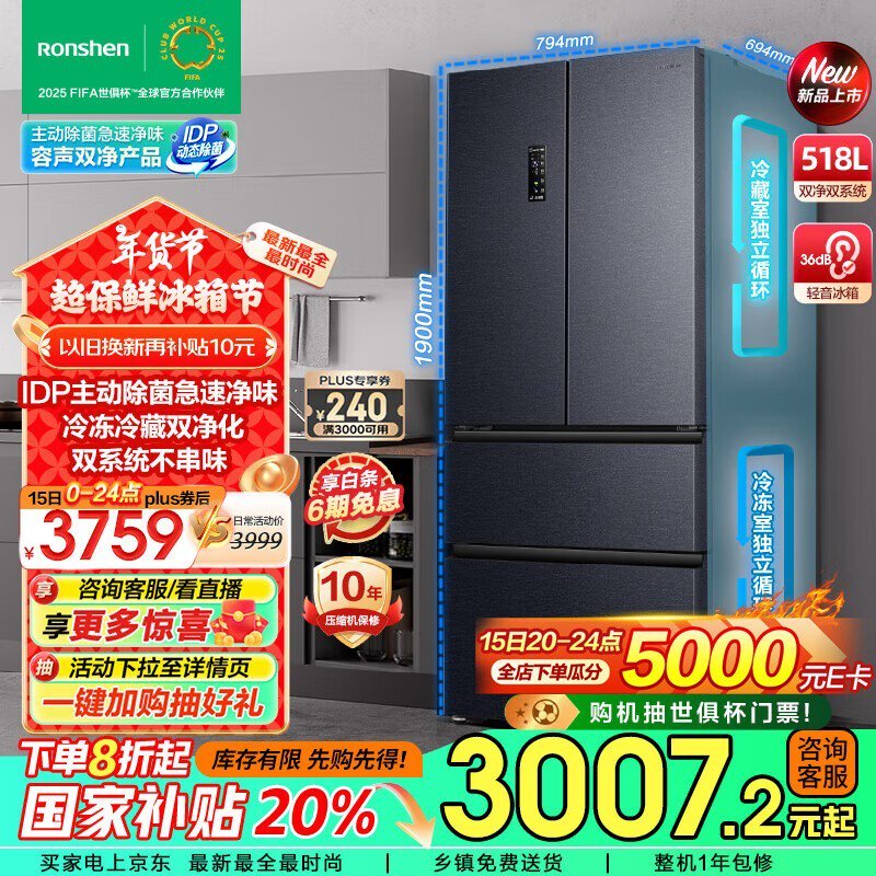 真便宜!容声 BCD-518WD15MPA 法式多门冰箱打六折了