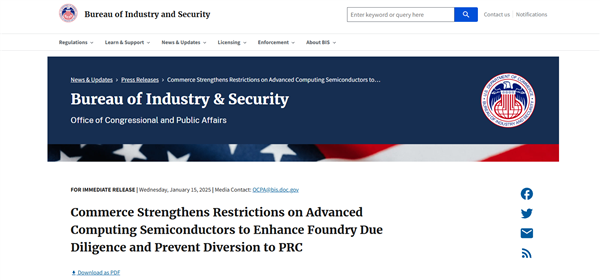 快科技1月16日消息,当地时间1月15日,美国商务部工业和安全局(BIS)修订了《出口管理条例》(EAR),发布两项最终规则,将25家中国企业列入实体清单。