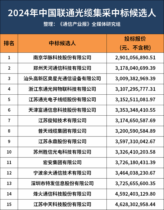 【通信产业网讯】(记者 高超)日前,中国联通2024年光缆集中采购项目结果揭晓,15家光纤光缆企业分享了这笔总计6578.59万芯公里的光缆集采大单。尽管该项目于2024年底发标,但是在2025年初开标,相关产品也将在近期完成交付。