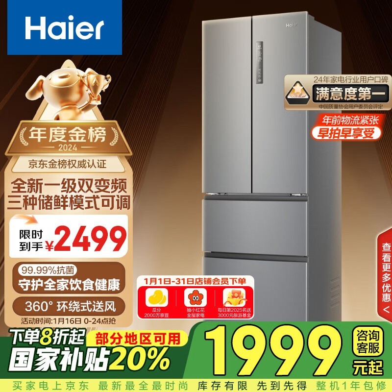 海尔节能大师系列冰箱补贴8折!到手仅1654元