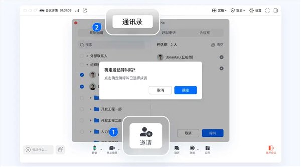 会议当中如果要拉入新的参会者,也可以直接在通讯录中发起呼叫,对方接听即入会,秒级摇人,不耽误会议进度。