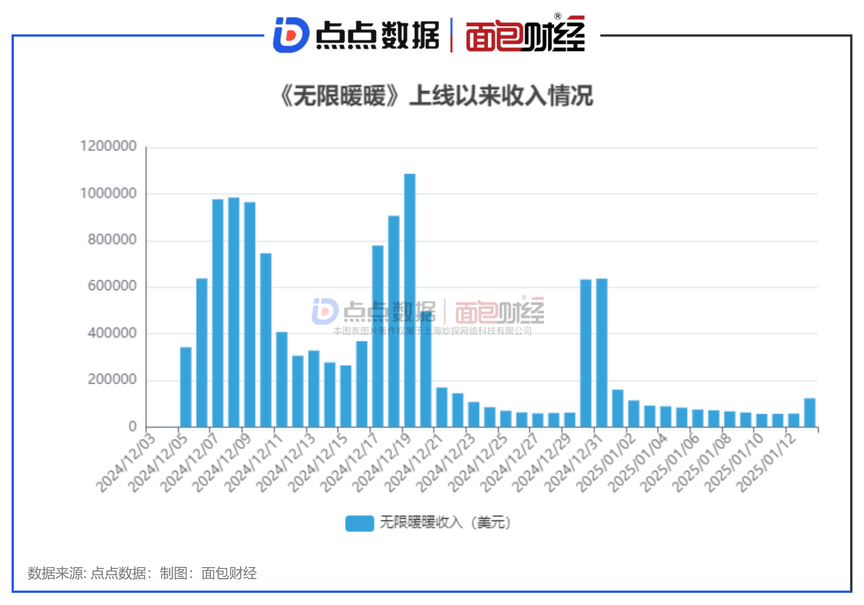 点点数据显示,《无限暖暖》在2024年12月19日达到了流水的高点,超过100万美元。