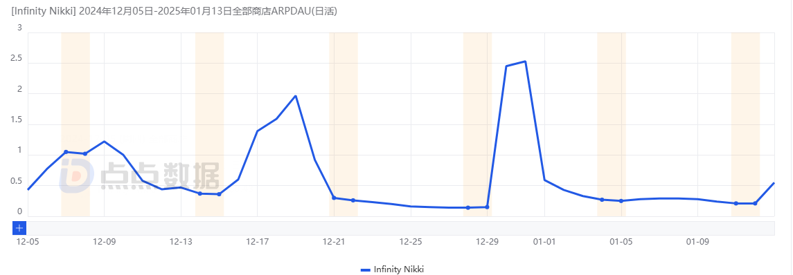 ARPDAU方面,点点数据显示,12月31日,《无限暖暖》ARPDAU达到近期高点,此后有所回落。