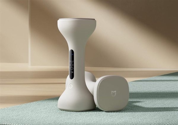 米家智能哑铃外观采用仿沙漏设计,搭配浅沙色外壳,手柄采用贴合手部的弧度设计,两端采用防滚设计,造型与小米logo相似。
