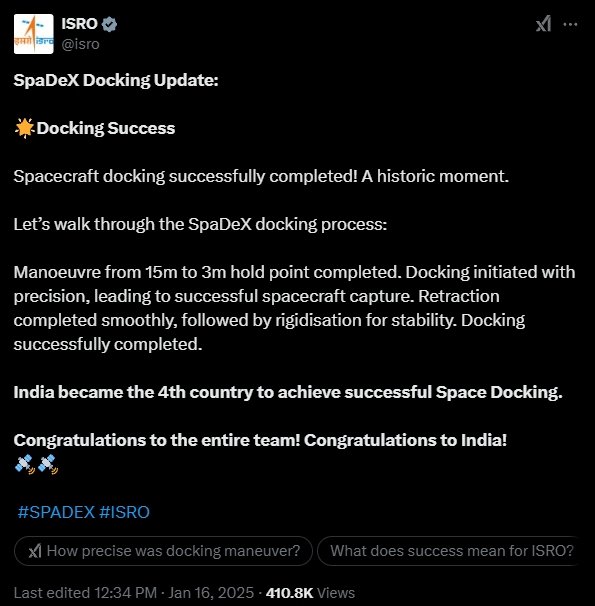快科技1月16日消息,据媒体报道,今日,印度空间研究组织(ISRO)宣布,“空间对接试验”(SpaDeX)对接成功完成,成为继美国、俄罗斯和中国之后的第四个独立掌握主动对接技术的国家。