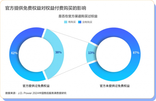 根据2024年中国售后服务满意度研究的数据显示,汽车厂商官方若为用户提供免费权益,将显著提升用户对付费权益的购买意愿。在官方提供免费权益的情况下,用户更愿意通过官方渠道付费购买更多权益,其购买率高达38%,相比之下,官方未提供过免费权益的用户购买率仅为13%。此外,豪华品牌用户中认为免费道路救援具有价值的比例达到27%,这一比例较主流品牌用户高出7个百分点。