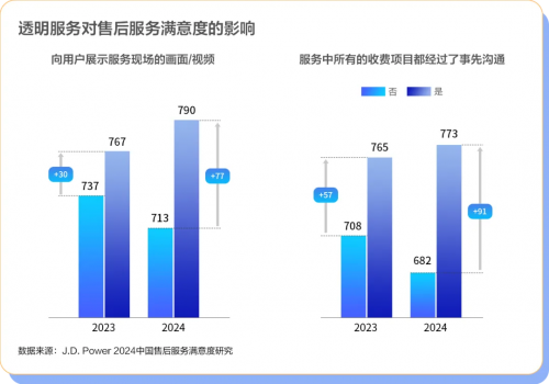 随着客户对于服务透明度需求的增强,向客户展示服务现场画面/视频的满意度得分比未展示的要高77分,上一年度这两项的差距为30分。另外,在售后服务涉及的所有收费项目中,若事先与车主进行了充分沟通的,其满意度得分比未沟通的情况要高出91分,上一年度这两项的差距为57分。多数经销商表示,售后透明服务对于4S店来说重要性不言而喻,一是要做到价格透明,这是客户关注的首要因素。进店维修保养客户能够清楚地了解维修、保养费用的构成。其次,服务透明同样关键,它对于提升售后服务质量和客户整体体验有着极大的助益。