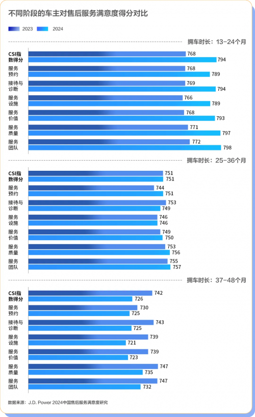 研究还发现,车主在其车辆拥有周期的不同阶段,对于售后服务的满意度评分亦呈现出显著差异。