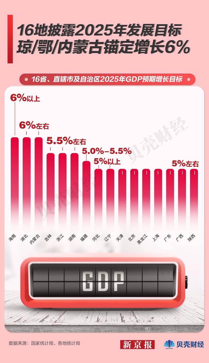 截至1月16日13时,16省、直辖市及自治区召开人代会,公布2025年经济增长目标,并部署相关重点工作。目前,经济增长预期最高的是海南,2025年地区生产总值预期增长6%以上;湖北、内蒙古锚定GDP增长6%左右;其余13省、直辖市及自治区则将GDP增长目标定于5.5%至5%之间。