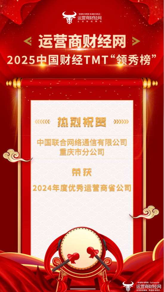 1月16日,由知名财经媒体平台——运营商财经网举办的2025中国财经TMT“领秀榜”盛典上,重庆联通凭借卓越的业绩和突出的贡献,荣获“2024年度优秀运营商省公司”称号。
