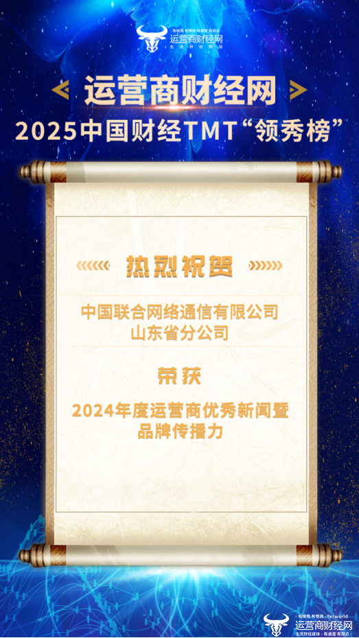 1月16日,在2025中国财经TMT“领秀榜”盛典上,山东联通成功斩获“2024年度运营商优秀新闻暨品牌传播力”奖,热烈祝贺!
