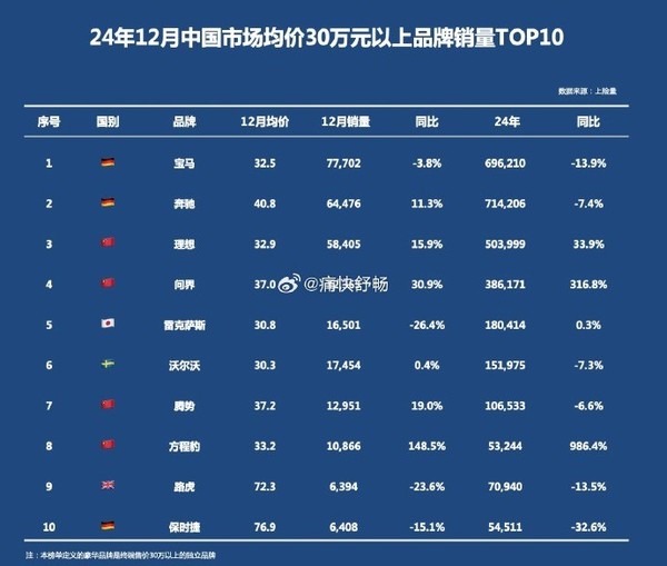 【CNMO科技消息】近日,CNMO注意到,有汽车博主发布了2024年12月中国市场品牌均价30万元以上销量TOP10榜单。榜单前三甲分别为宝马、奔驰和理想汽车。