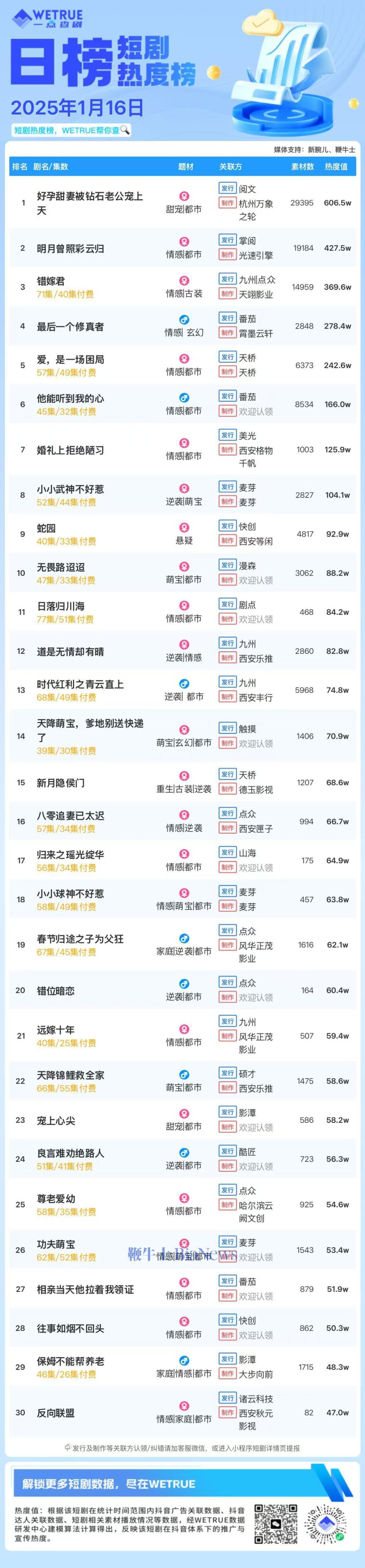 编者按:为帮助短剧从业者提供更多信息,专注于短剧报道的新腕儿和科技媒体鞭牛士联合WETRUE短剧热度榜共同推出短剧热度榜。