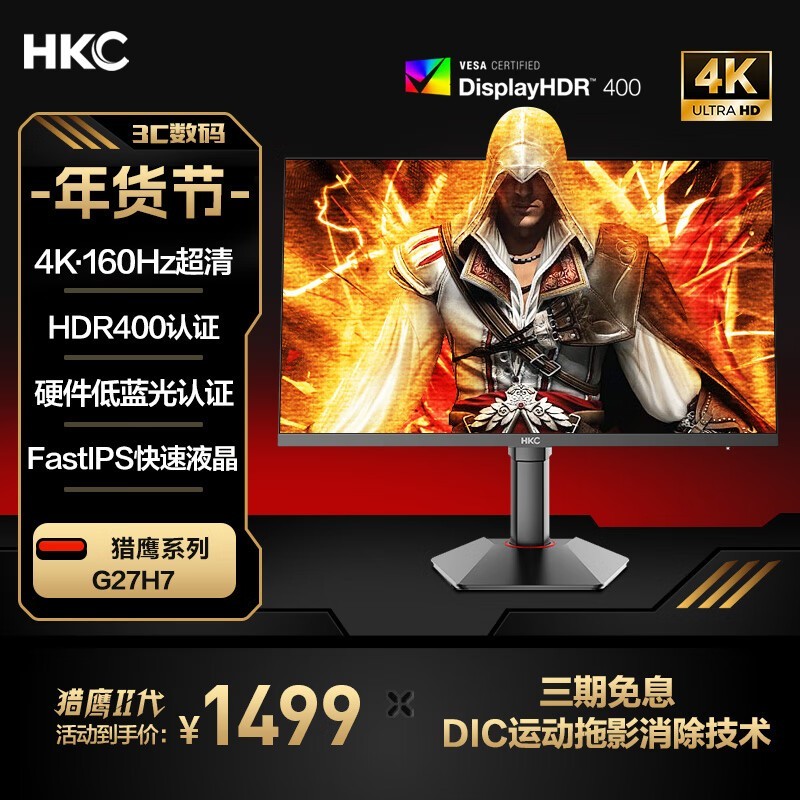 160Hz刷新率+4K超清分辨率 HKC G27显示器仅售1499元