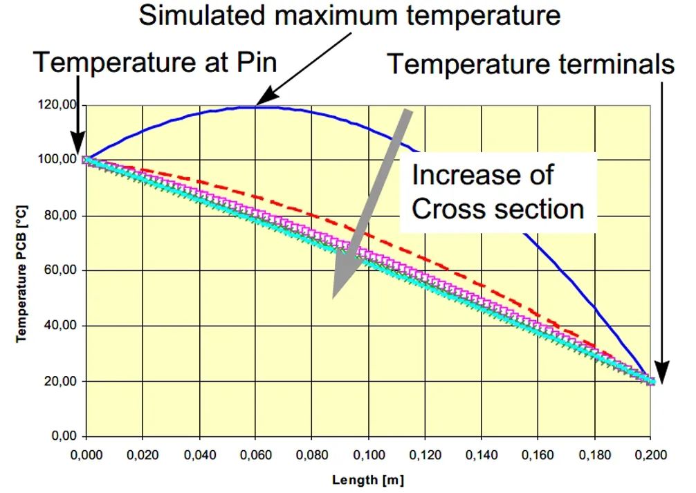 仿真案例中,200mm的直线走线,蓝线的最热距离针脚60mm。横截面大,最高温度就越低,而且远离针脚。