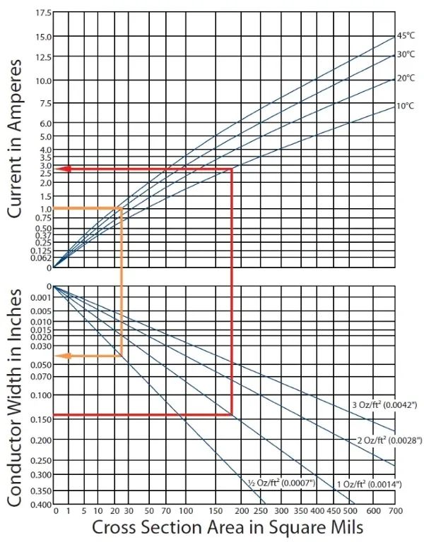 橙色箭头是从电流设计目标入手,查找线宽,图中电流为1A,目标温升30°C,垂直向下找到不同铜厚下,所需要的走线宽度,如使用0.5oz的铜厚时,走线宽度需要达到40mil。