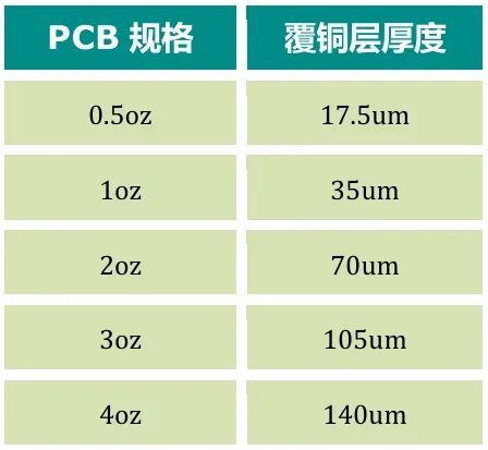 在PCB行业中,覆铜板的厚度用重量单位盎司表示,1oz意思是重量1oz的铜均匀平铺在1平方英尺的面积上所达到的厚度。PCB规格从0.5-10oz不等,常用的规格如下图,但在制作印刷电路板时还可以加厚,适当提高载流能力。