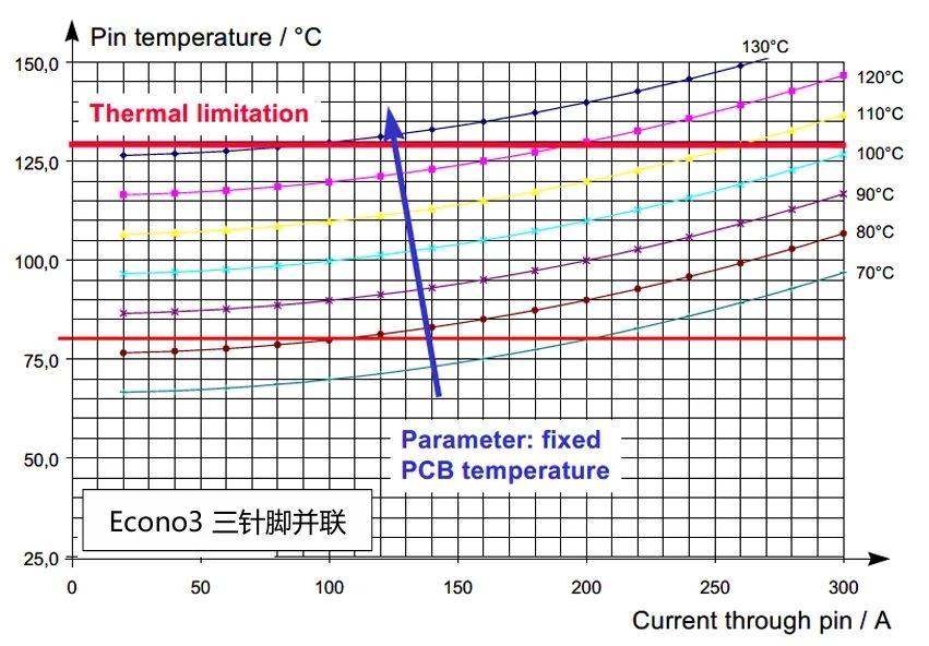 在功率线路板热设计时,第一步应该了解针脚的在实际线路板上载流能力。下图是Econo 2单一针脚和Econo 3三脚并联的图表,由于针脚损耗造成的热大部分通过线路板散掉,通过模块铜基板到散热器路径可以忽略不计。图表给出在不同的印刷电路板温度下的值。
