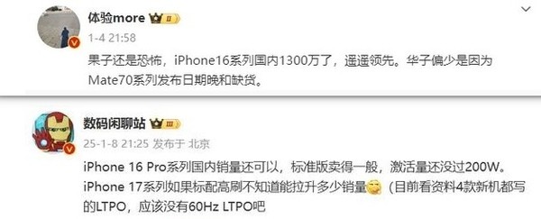 根据今年年初其他博主的数据,iPhone 16系列国内销量已达1300万台。另一名博主则透露,iPhone 16 Pro系列在国内的销量还不错,但标准版的表现很一般,激活量还没突破200万台。