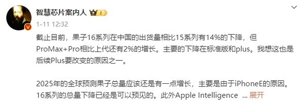 不过,博主表示,根据2025年的全球预测,苹果整体销量还是会迎来小幅增长,主要是由于iPhone E的存在,而iPhone 16系列总量下降是可以预见的。此外,Apple Intelligence到目前为止还没有证明对销量有所拉动。