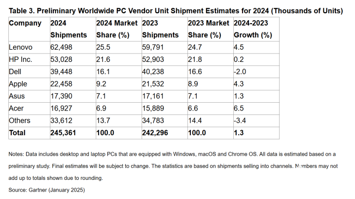 Gartner最新报告显示,2024年全年个人电脑出货量达到2.453亿台,比2023年增长1.3%。