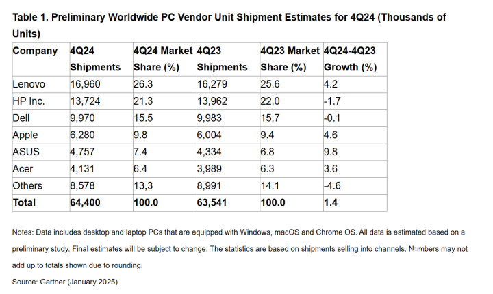 根据调研机构Gartner最新的研究报告显示,2024年第四季度全球个人电脑出货量为6440万台,比2023年第四季度增长1.4%,出货量连续第五个季度持续增长。2024年全年个人电脑出货量达到2.453亿台,比2023年增长1.3%。