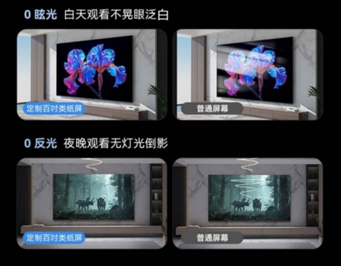 创维100A4F采用了半导体显示产业的头部企业京东方(BOE)特别定制的百吋类纸屏,其中的纳米蚀刻技术会将屏幕表面的光线漫反射到不同角度,在阳光充足、视野开阔的大厅,显示效果不受强光干扰,在夜晚客厅灯光众多的情况下,屏幕也不会有倒影,保证了观影沉浸感。同时拥有178°超广视角,还能根据环境光线进行亮度自适应调校,真正实现“0 反光、0眩光、0指纹”。