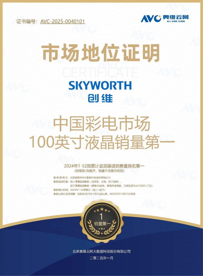 2025年伊始,国家消费品以旧换新政策再次升级。1月8日,国家发改委、财政部发布《关于2025年加力扩围实施大规模设备更新和消费品以旧换新政策的通知》(下称“通知”)。通知第十条提到“加力支持家电产品以旧换新”,拥有十足吸引力。在竞争激烈的电视市场中,创维凭借其卓越的产品品质和创新技术,于2024年全年持续展现了强大的市场号召力,拒奥维云网2024年W1-W52(1月1日-12月29日)数据显示,创维成功夺得中国彩电市场100英寸液晶销量第一。