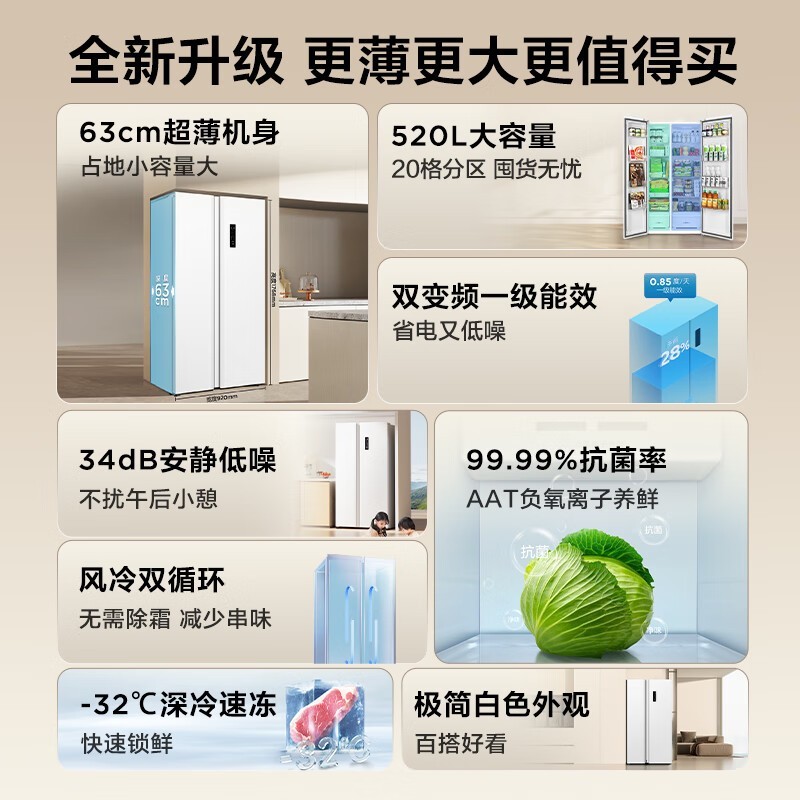 TCL V7系列 R520V7-S 风冷对开门冰箱:1391元入手