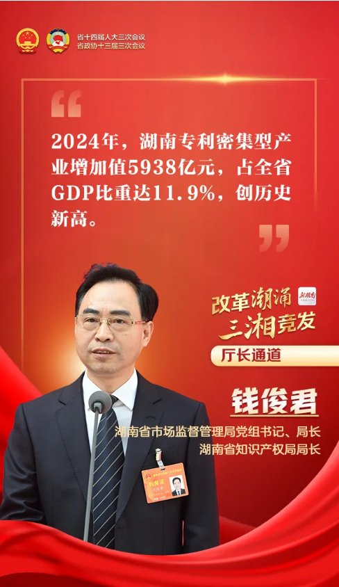 “2025年,我们将聚焦高质量创造、高效益运用、高标准保护、高品质服务,用知识产权的‘繁星点点’,点亮湖南高质量发展的‘星光大道’。”1月16日,在湖南省十四届人大三次会议第二场“厅长通道”上,湖南省市场监督管理局党组书记、局长,省知识产权局局长钱俊君回应民之关切。