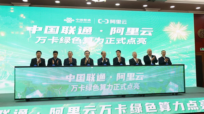 点亮活动中,吴晓军、罗东川、陈忠岳、简勤、李津等共同触摸冰屏,点亮中国联通·阿里云万卡绿色算力项目。中国联通集团公司相关负责人发布了万卡绿色算力产品。