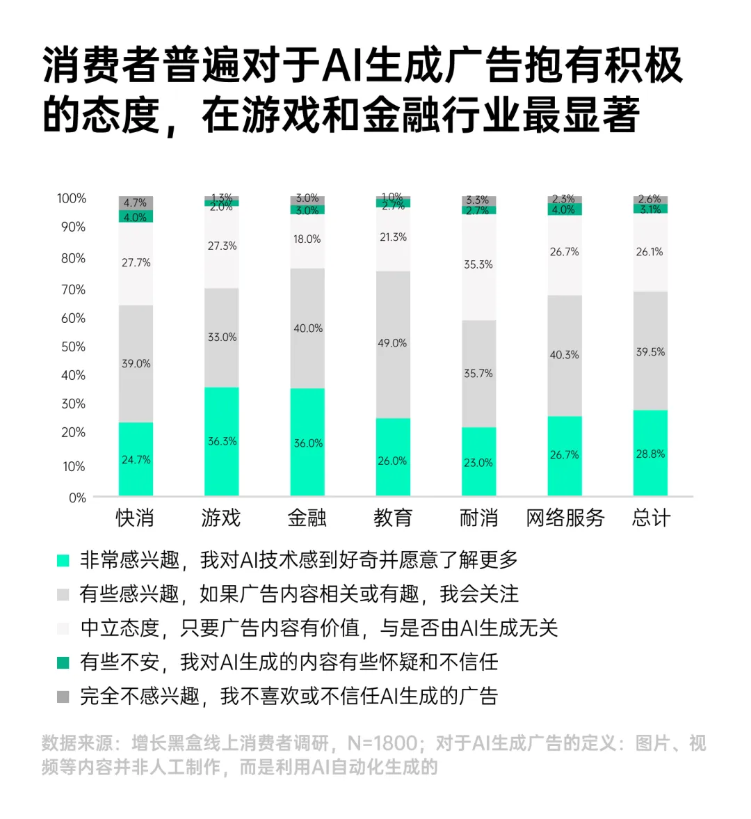 我们的数据也显示,中国消费者对于AI广告营销普遍具备积极的态度,同时众多行业的AI广告渗透率也达到了较高的程度。