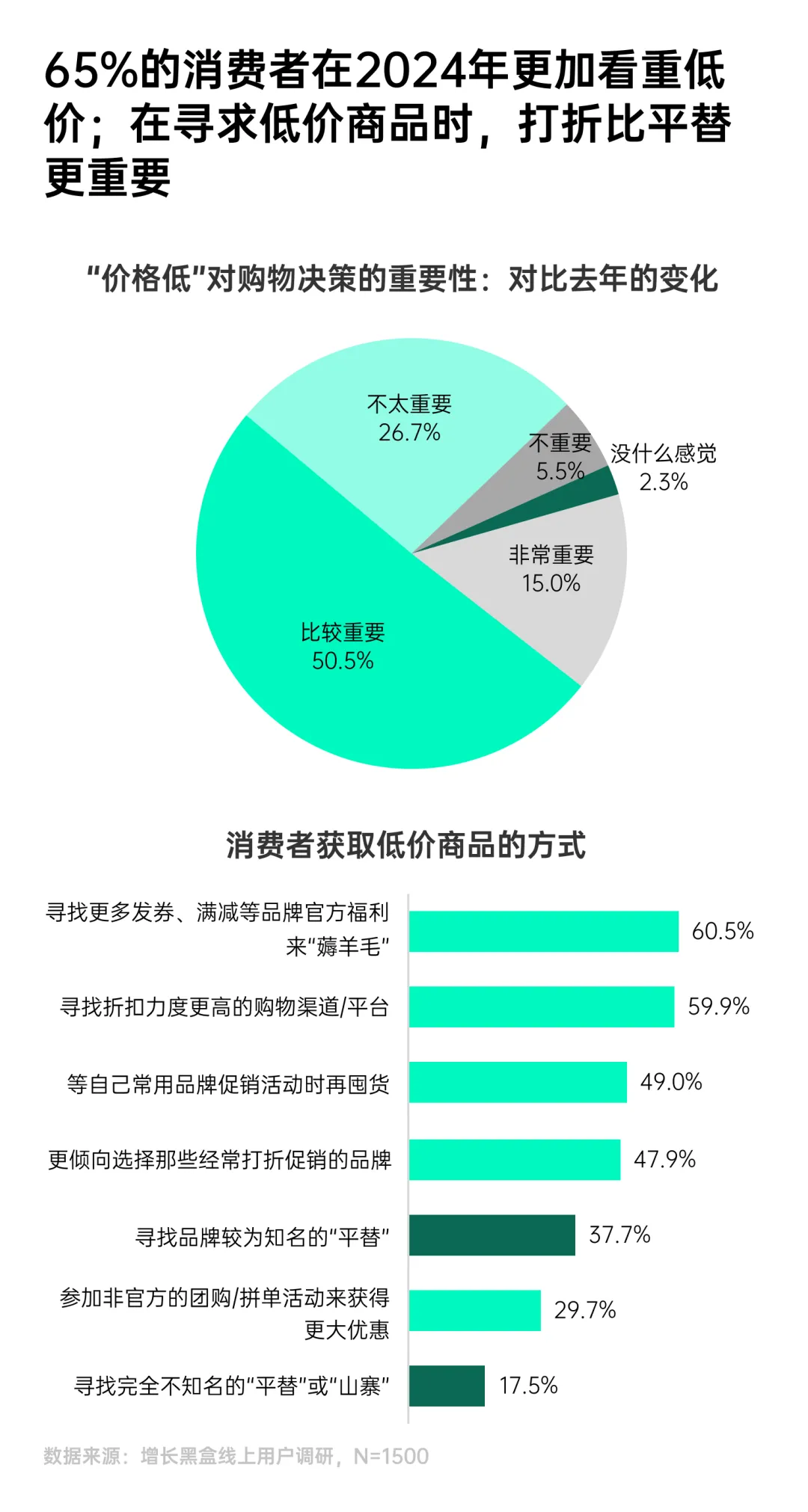 在2024年,65.5%的消费者认为低价对于购物决策相比前一年更重要了。这背后必然有商家价格战带来的心智影响:在寻求低价商品的方式上,有6成消费者倾向于找品牌官方“薅羊毛”,还有6成消费者会主动选择折扣力度更高的渠道。消费者对于折扣的倾向性,已经超过了一度流行的“平替”。