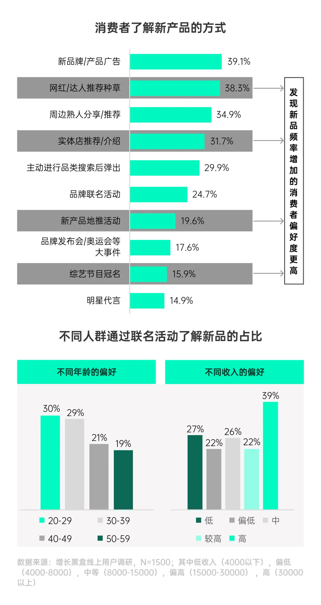 网红达人与熟人推荐,依然是最主流的品牌破圈方式。但也可以看到,品牌联名活动的排名已经超过了传统的综艺冠名、明星代言,排名仅次于主动搜索。这种方式在年轻人和高收入人群中尤为重要。