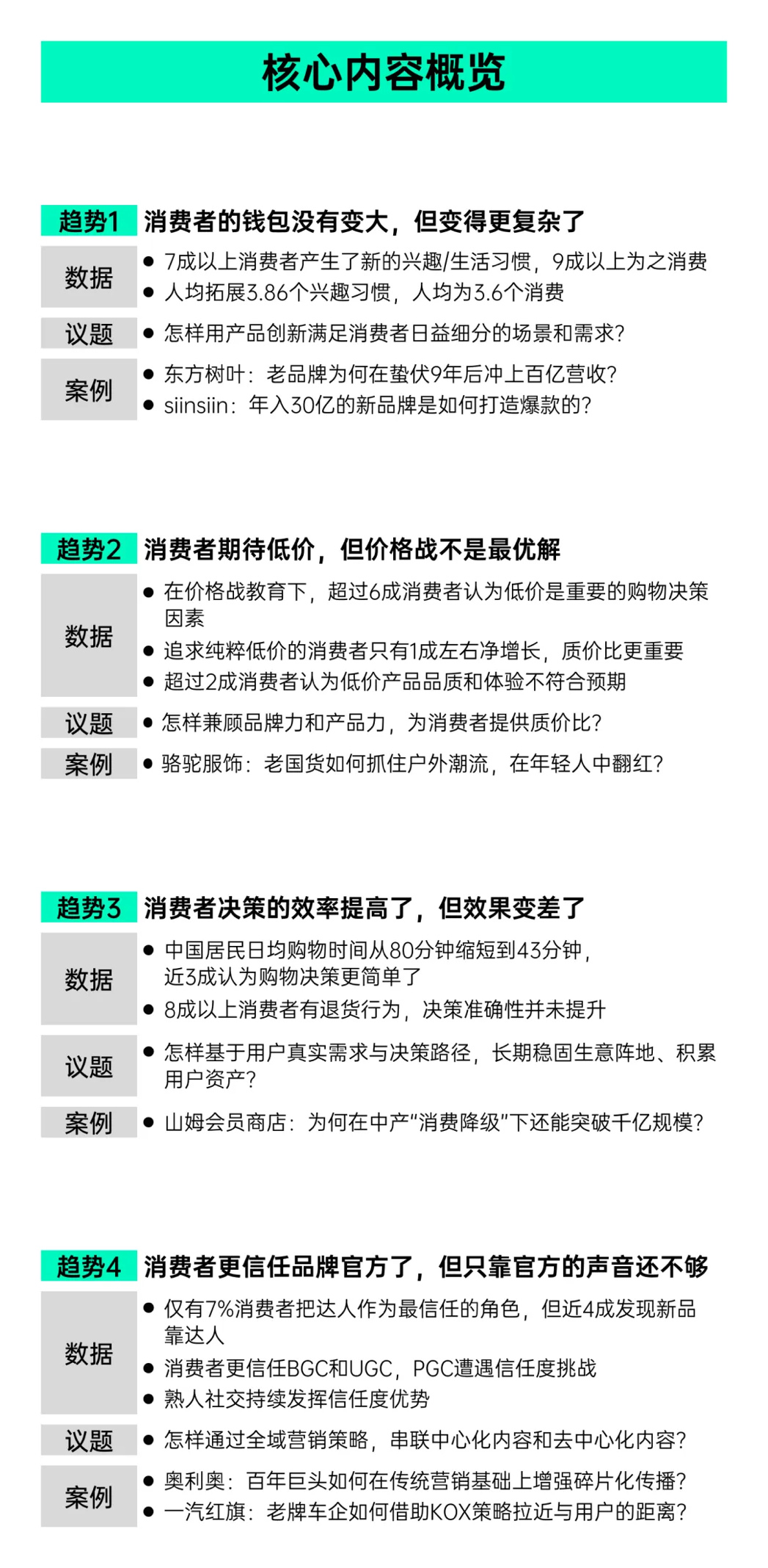 在本篇报告中,我们不仅研究了2024年消费者的需求趋势,还通过拆解头部品牌的案例,挖掘了行业最佳实践。这分别对应了产品、营销、渠道、技术上可能存在的增长策略创新点,希望能够帮助读者们拓宽思路,为2025年的业务增长提供参考。
