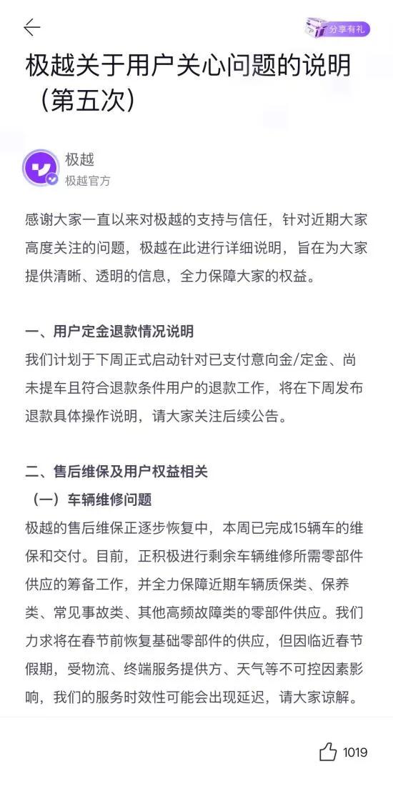 在1月10日的“说明”中,极越则表示售后维保正逐步恢复中,近一周已完成15辆车的维保和交付,将全力保障用户“基于国家法律规定和既定合同约定的质保权益”。