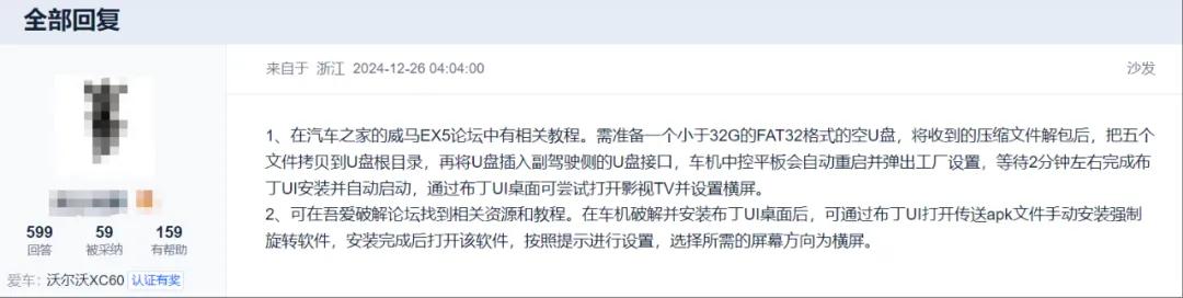 汽车论坛上,一名威马车主分享威马EX5如何安装横屏补丁。