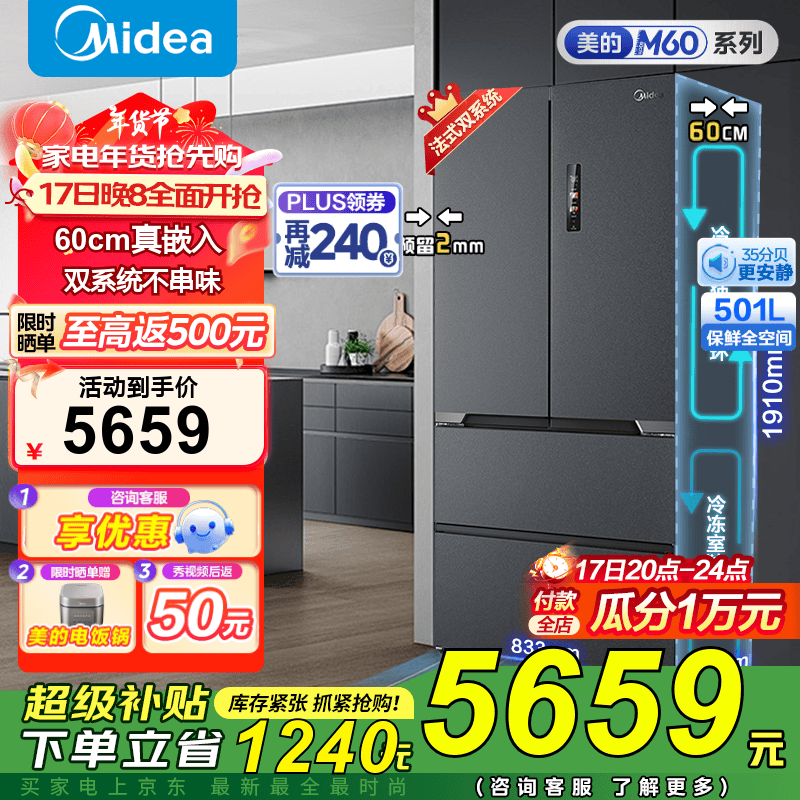 美的MR-526WUFPZE法式多门冰箱4100到手!
