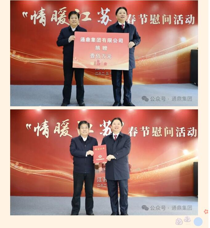 捐赠仪式由省慈善总会副会长兼秘书长戚锡生同志主持,通鼎集团沈小平代表公司向江苏省慈善总会捐赠善款100万元,戚锡生副会长代表省慈善总会接受捐赠并向爱心单位及个人颁发捐赠证书。该项资金将全部用于开展省“情暖江苏”各地春节慰问活动,旨在进一步汇聚慈善力量,营造崇德向善的良好氛围,为困难群众奉献爱心、排忧解难。