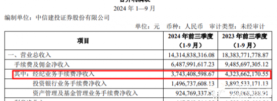 值得一提的是,据中信建投2024年三季度报告显示,在合并利润表中公司的经纪业务手续费净收入为37.43亿元,同比上年同期的43.24亿元有所下降。
