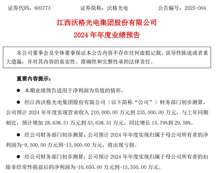 1月17日晚间,江西沃格光电集团股份有限公司发布2024 年年度业绩预告,预计 2024 年年度实现营业收入 210,000.00 万元到 235,000.00 万元,与上年同期相比,预计增加 28,638.51 万元到 53,638.51 万元,同比增长 15.79%到 29.58%。