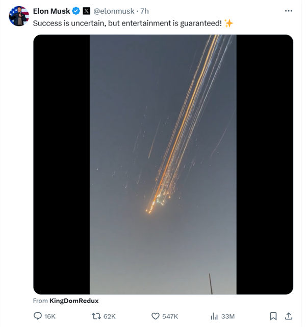 同日,SpaceX创始人埃隆·马斯克发帖并附视频调侃称,“成功是不确定的,但娱乐是有保证的!